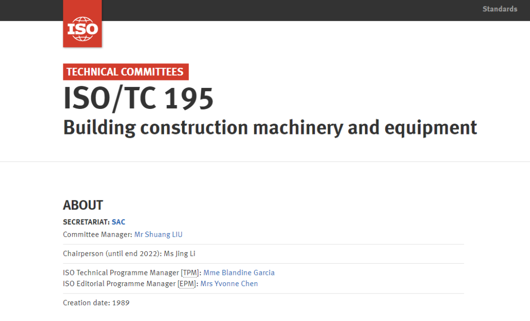 經(jīng)國際標準化組織(ISO)TMB同意,自2020年5月1日起,ISO/TC195國際標準化組織建筑施工機械與設備技術委員秘書處由中國(SAC)獨立承擔,秘書處承擔單位為北京建筑機械化研究院有限公司,北京建筑機械化研究院有限公司劉雙任ISO/TC195委員會經(jīng)理(原稱為秘書),李靜任ISO/TC195主席(2020年-2022年)。